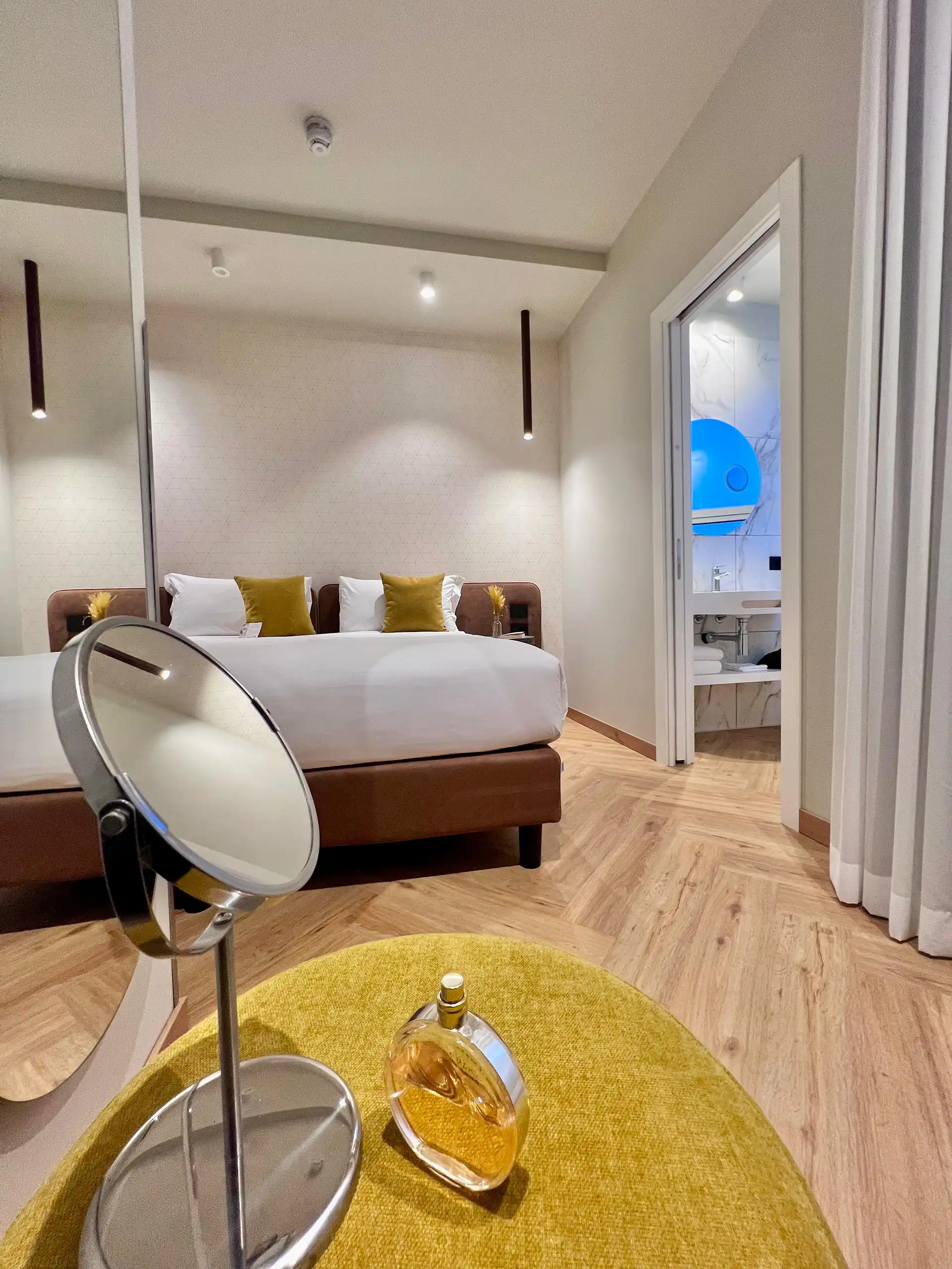 Raffinata e accogliente con vista panoramica, la Camera King presenta ambienti ampi e luminosi, con design moderno dai toni caldi, pavimento in legno a spina di pesce e arredi curati nei minimi dettagli.